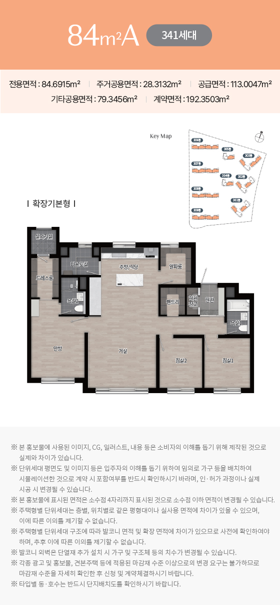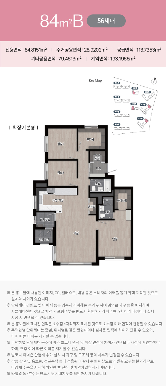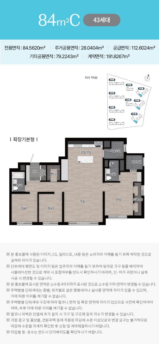 ※ 동일한 주택형이라도 세대가 속한 동 및 라인에 따라 세대입구 공용부분 및 서비스 면적 등이 상이할 수 있으니, 충분히 숙지하시기 바랍니다.